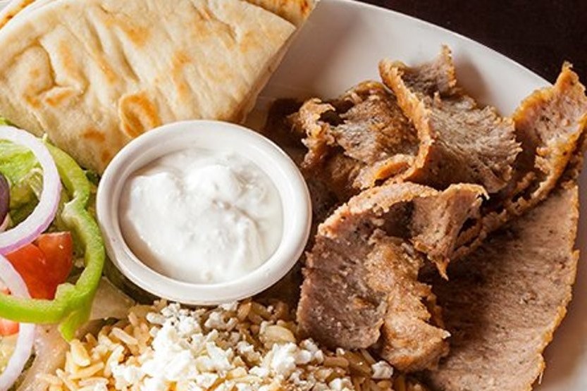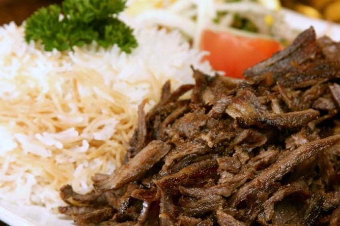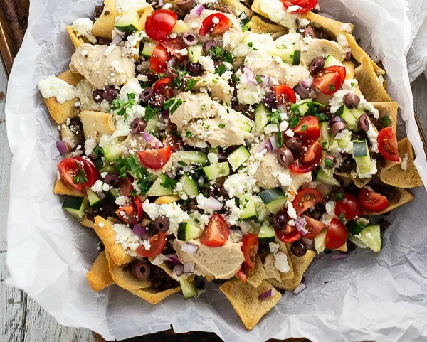 Fresh fried pita chips topped with garlic sauce, chicken shawarma, onion, tomatoes, and feta cheese